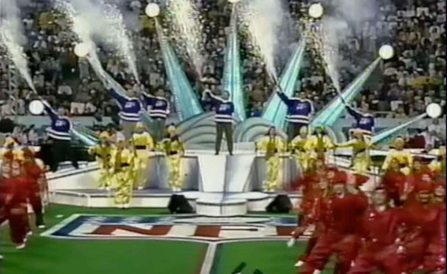 To put this in context, when the sketch comedy show In Living Color did an alternative halftime show in 1992, they drew over 22 million viewers–one fourth of the total viewers of the Super Bowl. This was also a rebellion against the mainstream culture being celebrated at America’s most watched event. In Living Color was a pioneering Black-led sketch comedy show (featuring a young Jim Carey), while early 90s halftime shows were unbelievably old-timey. Per Wikipedia’s description, the 1992 show: